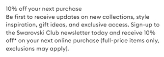 Abonnez-vous à Swarovski.com et saisissez ce coupon pour économiser 10% de réduction sur votre commande à la caisse.