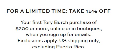 Inscrivez-vous par e-mail à ToryBurch.com et profitez de cette promotion pour économiser 15% de réduction sur votre première commande de plus de 200 USD à la caisse.