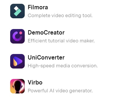 Vous souhaitez transformer vos photos en une vidéo étonnante et originale ? Voulez-vous convertir un texte et un enregistrement audio en une vidéo dynamique avec des avatars IA ? Voulez-vous convertir facilement votre vidéo 2D en une vidéo 3D ? Ou peut-être avez-vous besoin d'un outil DVD puissant ? Vous les trouverez tous dans la catégorie Créativité vidéo. Ici, vous aurez accès à des produits primés comme Filmora, DemoCreator, UniConverter, Virbo, Presentory et bien d'autres. Et maintenant, vous pouvez réduire considérablement le coût de votre achat grâce aux codes de réduction officiels de WONDERSHARE.